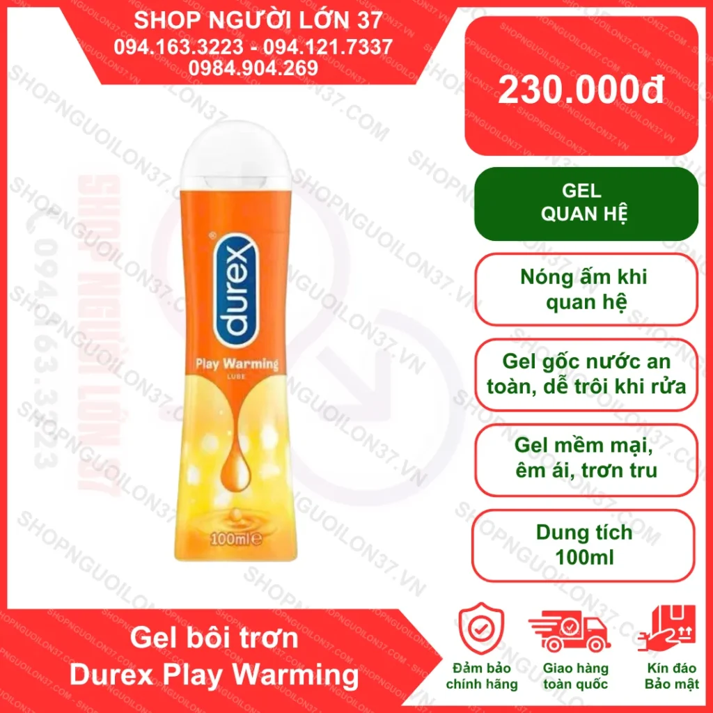 Nếu bạn đang muốn mua Gel bôi trơn ấm nóng Durex Warming – Chai 100ml chính hãng, giá tốt và giao hàng kín đáo, thì đừng bỏ qua SHOP NGƯỜI LỚN 37 – địa chỉ uy tín hàng đầu tại TP Vinh và toàn quốc.